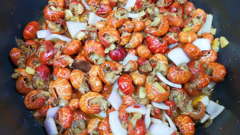 11. 十分钟以后啤酒挥发的差不多了,虾尾也已经入味,下入洋葱翻炒提味。