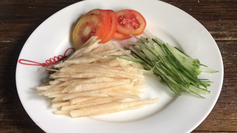 10. 番茄洗净切片、梨去皮洗净切丝、黄瓜洗净切丝