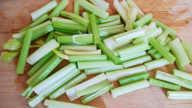5. 三根水芹摘去叶子清洗干净,切成小段。