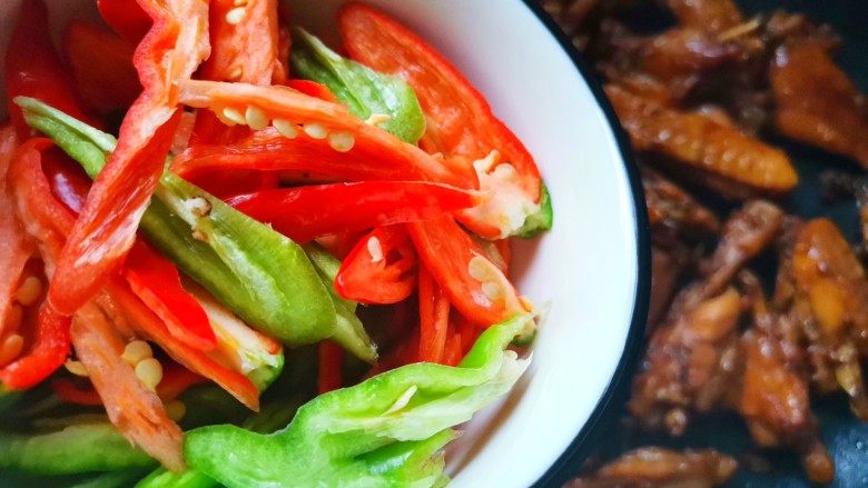 11. 将辣椒洗净切断,腌制好的鸡翅抹去蒜末,不粘锅倒适量油烧热,鸡翅下锅小火煎至金黄色,过程可以盖盖子焖一会儿