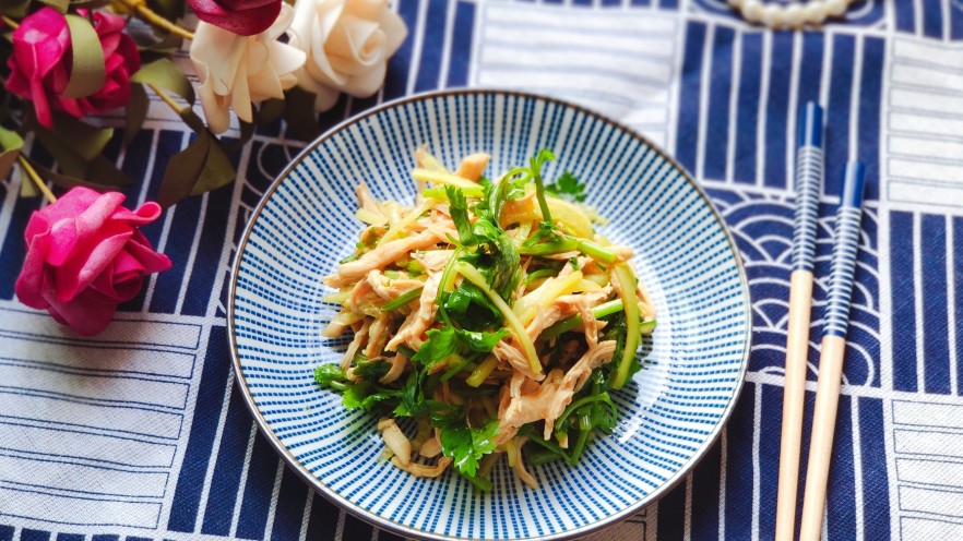 9. 香菜,黄瓜,鸡丝全部放入大碗