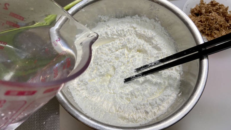 3. 取揉面盆,加入小麦淀粉200g,木薯淀粉60g,2g食盐,搅拌均匀,刚烧开的开水,一点点加入,边加边搅拌,约280g左右的开水