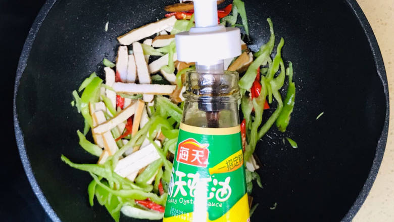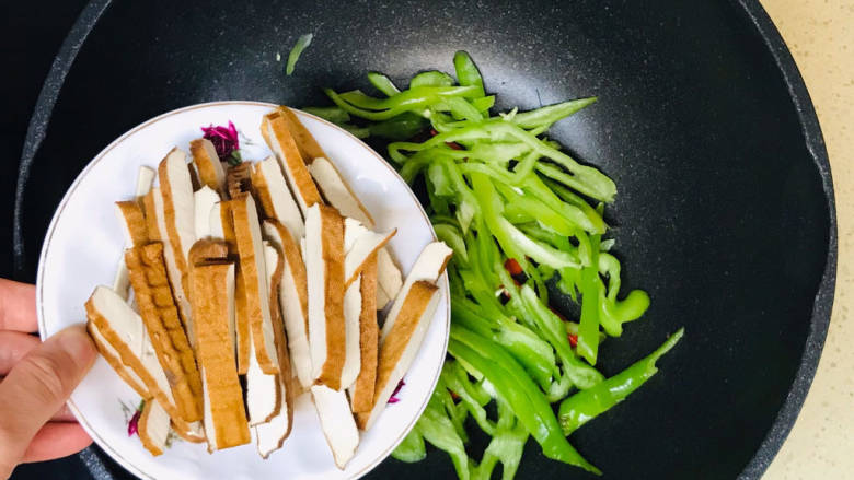 豆干富含植物蛋白质,与青红椒一起炒制,口味微辣,超级下饭。