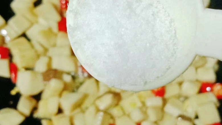 宫保杏鲍菇,倒入炒软的杏鲍菇丁