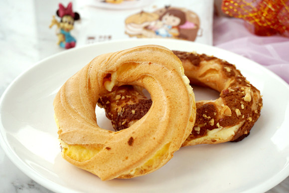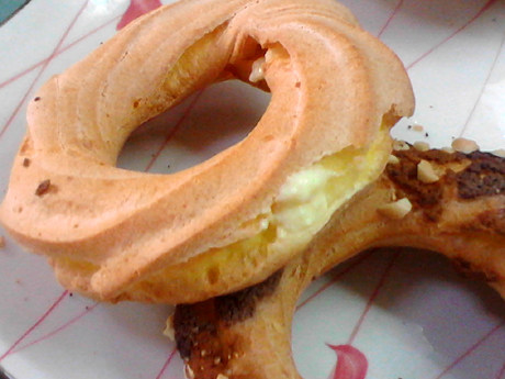 剩下的最后1/4袋泡芙粉,来个泡芙圈,顺手把先前做泡芙剩下的脆皮以及忘记使用的花生碎给解决掉。然后,就告别泡芙吧。这个夏天,实实过足了一把泡芙瘾,虽然落进自己肚里的很少。 挤一个环,依旧希望会是小小可爱的小圈圈。虽然是第四次用这粉,却还是无法预料它最终能达到的胀度。依然是挤挤满满的一盘,肥肥大大的环。这得多少馅儿来填啊? 用了奶油卡仕达,在那些孔洞里肆意穿梭,从这个孔里钻进去,又从另一个洞里淌出来。香甜到无以复加。。。。