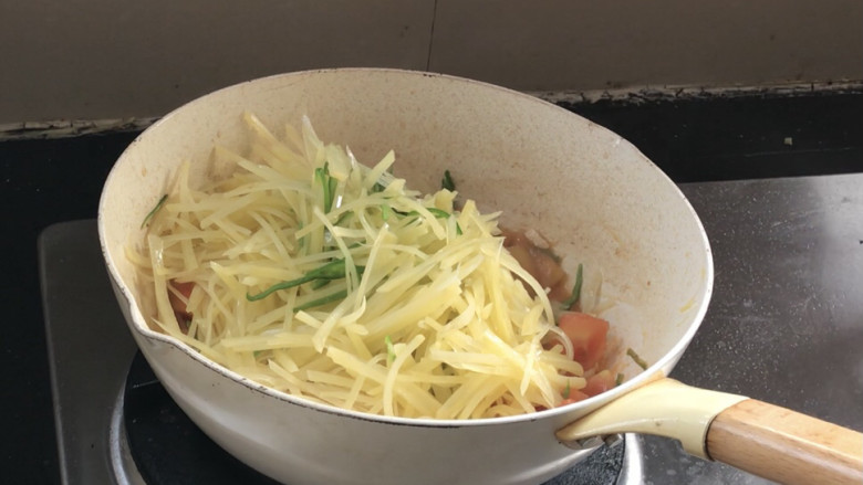 2. 土豆去皮,洗净后切薄片,再切成丝