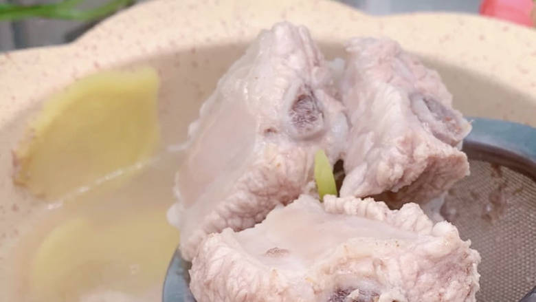 1. 排骨剁成大小一致的小块 葱,姜,料酒。 凉水下锅,下入事先剁好的排骨,葱,姜,倒入适量的料酒。去除血末即可。