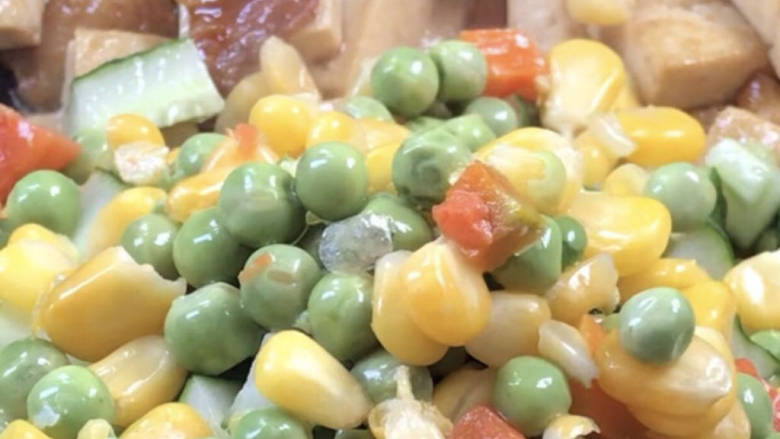 10. 加入洋葱、黄瓜和三色丁翻炒均匀至入味,出锅前加入味精调味