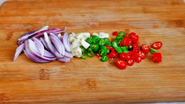 5. 洋葱大蒜去皮切好,红绿辣椒切段。