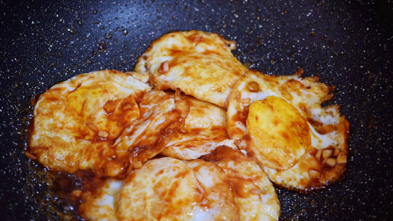 8. 烧至酱汁浓稠时放入荷包蛋,翻炒均匀后加盖焖煮2-3分钟
