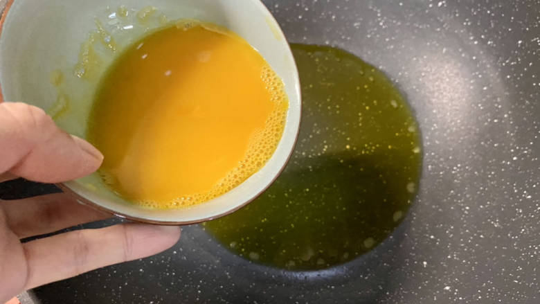 6. 热锅加适量食用油,油热下蛋液,滑炒炒散盛出