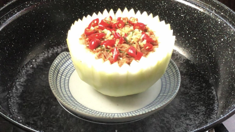 虾米冬瓜盅,将冬瓜盅放入开水锅中,盖上锅盖隔水蒸20分钟