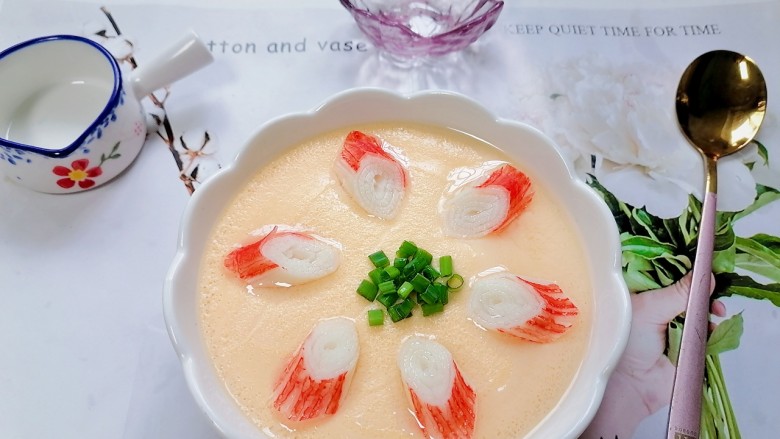 15. 拍上成品图,一道嫩滑爽口美味又营养的蟹棒蒸蛋就完成了。