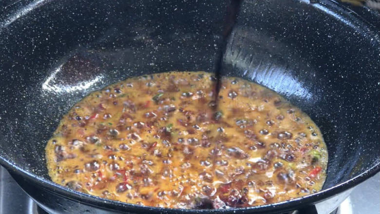 11. 就着油锅放入花椒粒炸香,加入另一份葱姜蒜炒香