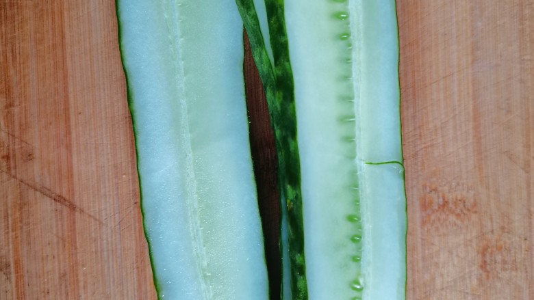 1. 黄瓜一个,清洗干净,去掉头尾,再把它切成长长的厚片