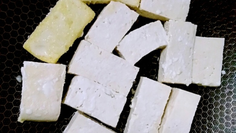 5. 再起锅烧油,把豆腐两面都沾上淀粉,再放入锅中,小火慢煎