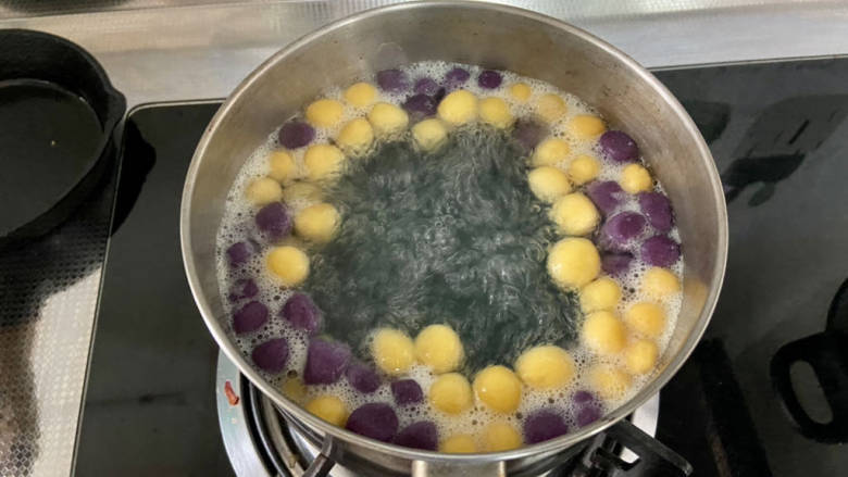 13. 水开,下小芋圆,中小火煮到芋圆熟透浮起