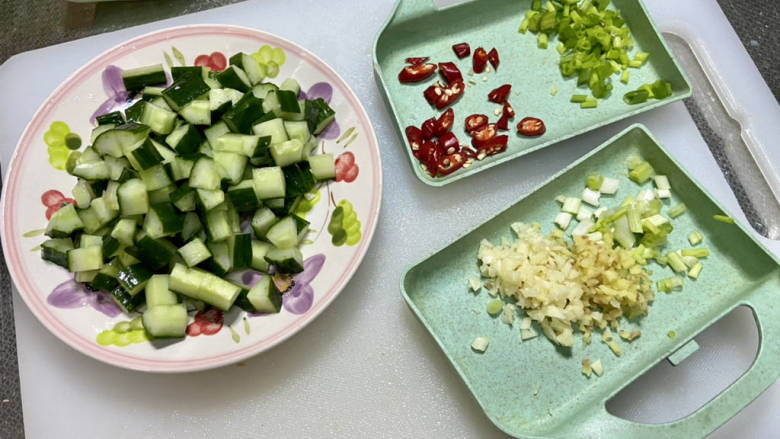 3. 黄瓜切小块,小米辣切圈,小葱葱白葱叶分别切末,姜蒜切末