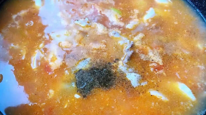10. 倒入烧开的番茄汁添加调味料黑胡椒粉、盐大火炖制鱼骨完全熟透