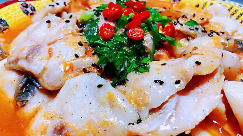 14. 鱼片均匀的摆在鱼头鱼骨上面淋上汤汁撒上黑芝麻再摆上香葱小米辣最后淋上热油次啦次啦悦耳的响声瞬间满屋飘香