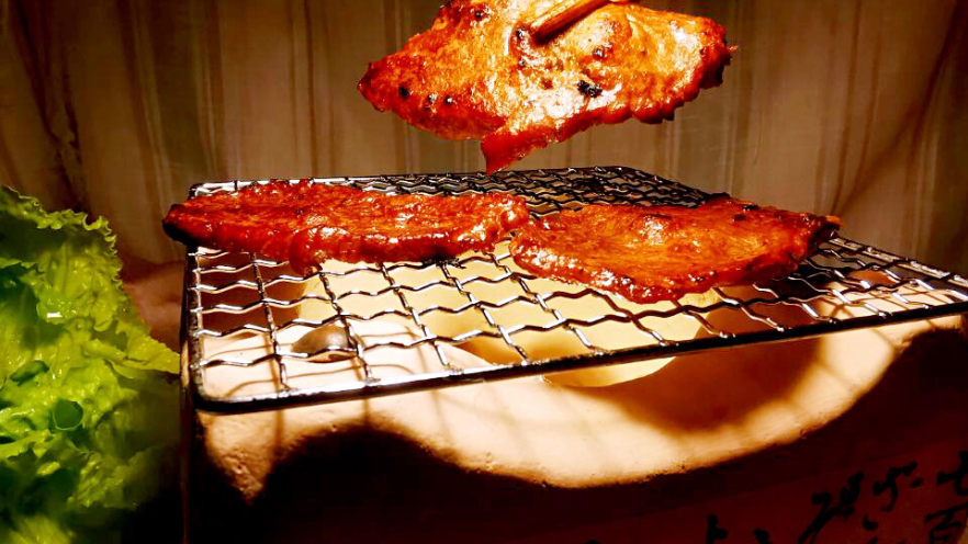 15. 碳烤小炉子架上网,将烤好的肉片继续用文火逼出肉香。(烤箱控制在九成熟,上桌再碳烤一下,可缩短烤肉时间,香气更足)