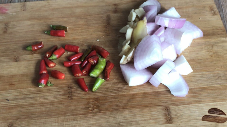4. 洋葱洗净切成小块,小米辣洗净切成小段,备好姜蒜碎