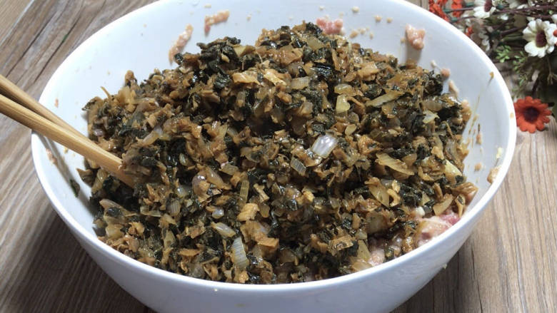 11. 凉透后的梅干菜,加入肉末中,搅拌均匀