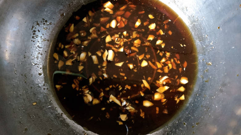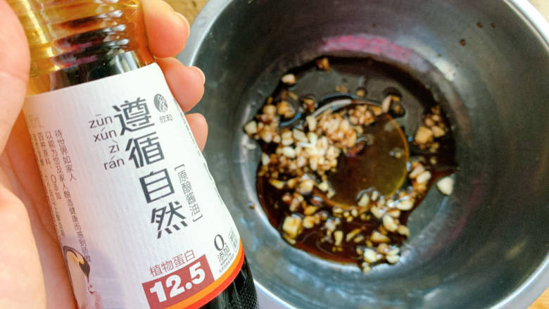 8. 将蒜丁或蒜蓉加到容器中,加5小勺酱油调味