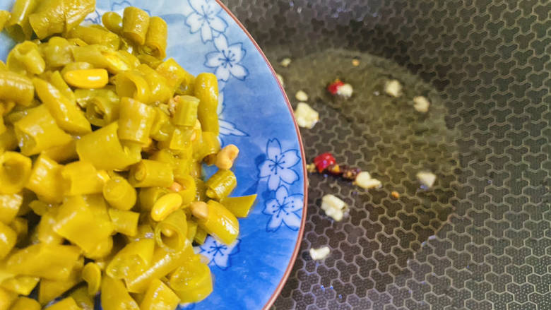 5. 放入酸豆角翻炒片刻