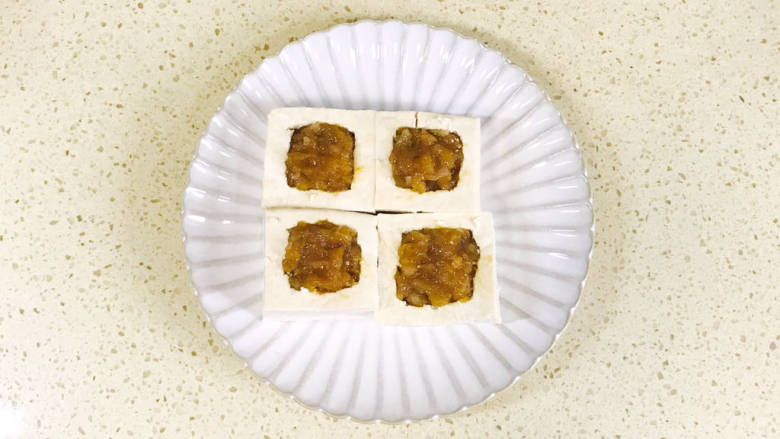 6. 豆腐切成四四方方的豆腐块,用勺子一头挖出空心