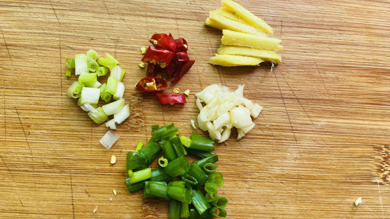 5. 起油锅放入姜、葱、蒜、辣椒爆香