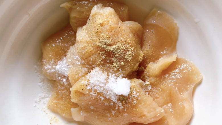 3. 加少许盐、糖、胡椒粉腌制均匀