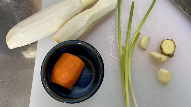 2. 茭白去外壳削去老皮清洗备用,胡萝卜削皮洗净,小葱择好洗净,蒜剥皮,姜搓洗干净