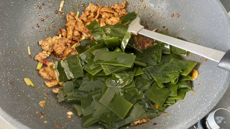 4. 坐锅烧水,水开下海带片,焯水半分钟,捞出过凉沥水备用