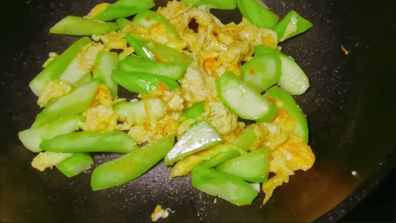8. 鸡蛋炒好后盛出,下入我们准备好的丝瓜~翻炒半分钟左右,再加入一丢丢盐。
