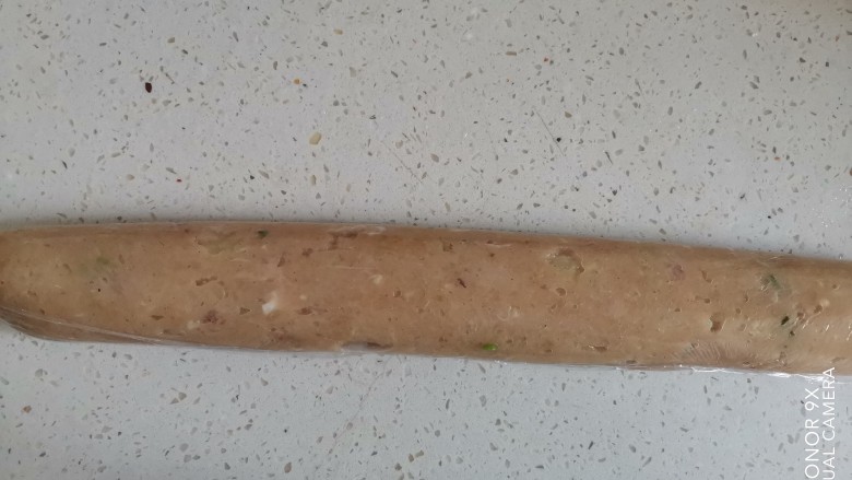 8. 然后用保鲜膜卷起来,两头捏紧搓成长条,放入冰箱冷冻四个小时