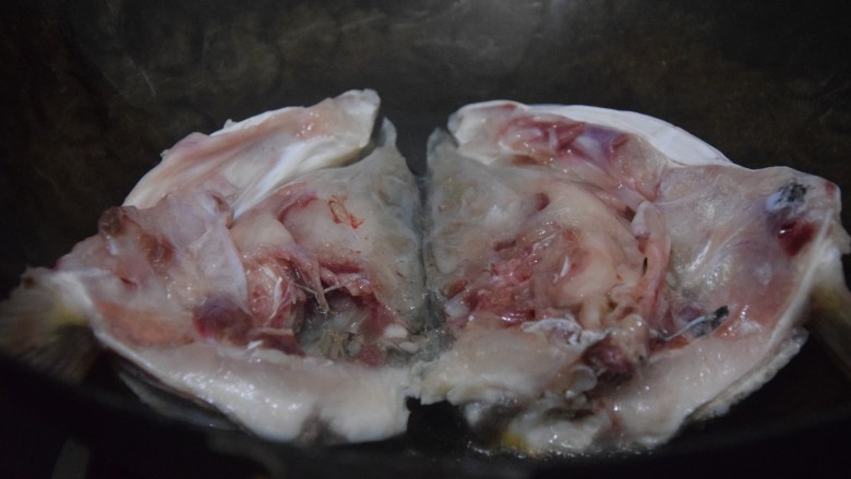 4. 热锅凉油,放入鱼头,小火慢煎至焦黄