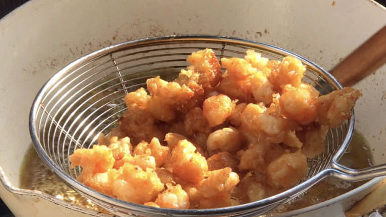 11. 再放入虾仁炸至金黄色,捞出沥油备用