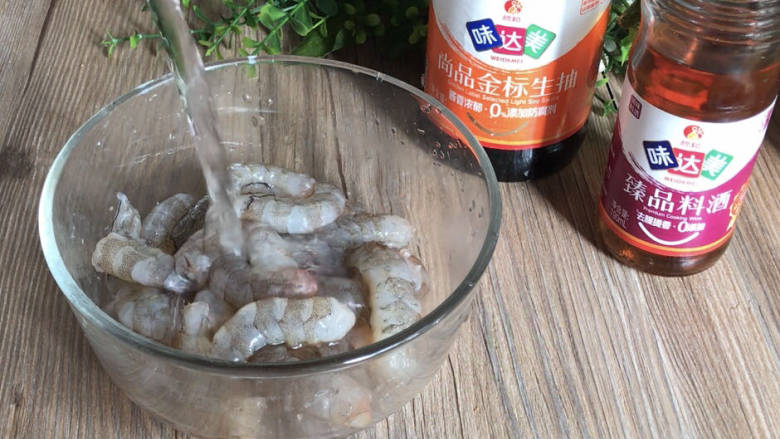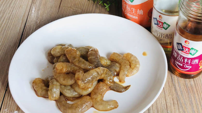 9. 起锅烧油至4成热,放入虾仁,定型后拌匀