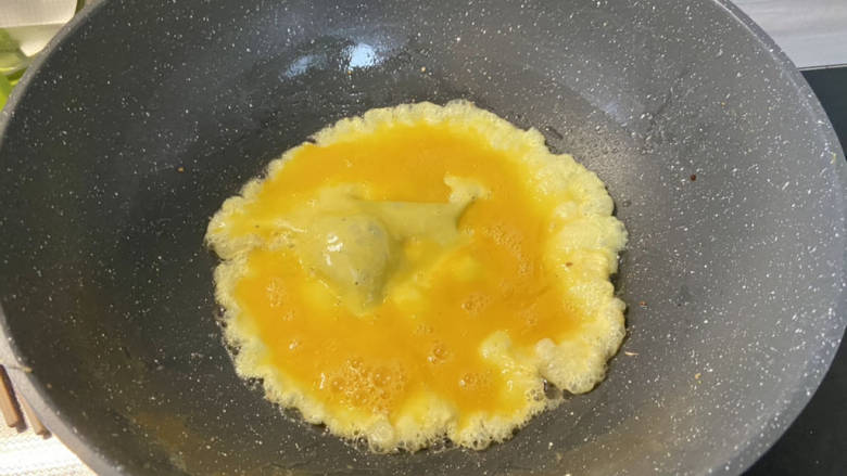 6. 热锅加适量食用油,油温热,下蛋液,滑炒成型,炒散盛出