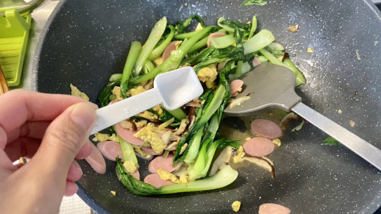14. 尝下咸淡,根据个人口味补充少许食盐,翻炒均匀出锅