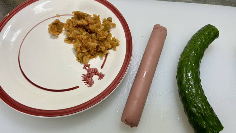 7. 黄瓜搓洗干净,火腿肠去包装,