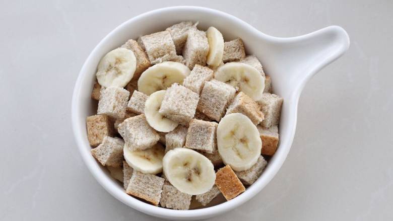 5. 接着放入全麦面包块,剩余香蕉随意放在上面。