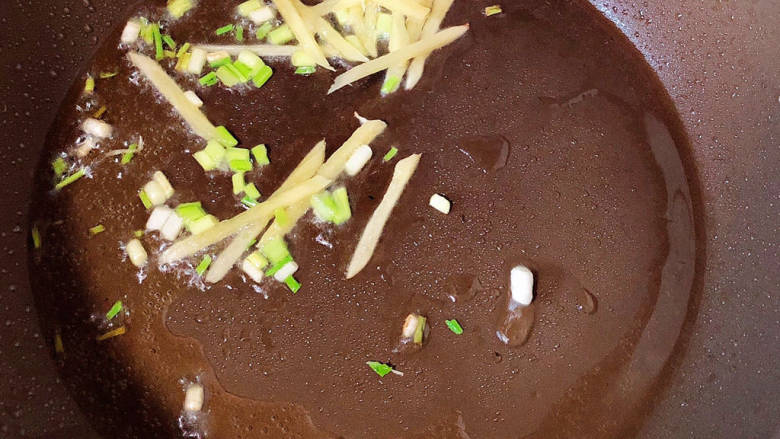 7. 锅中倒入油,加热至五成热,放入葱姜爆香。