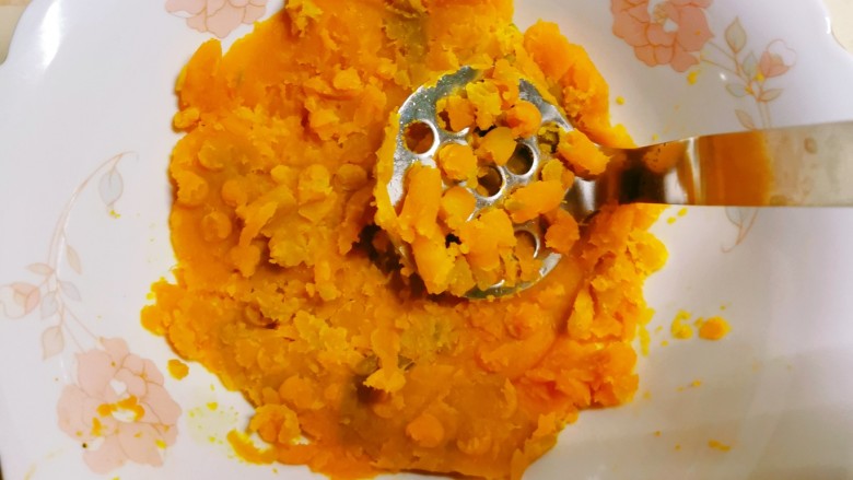 3. 取100克南瓜果肉,加入黄油碾压成泥。