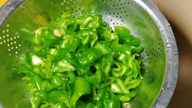 5. 将腌好的青椒洗净后沥干水分备用