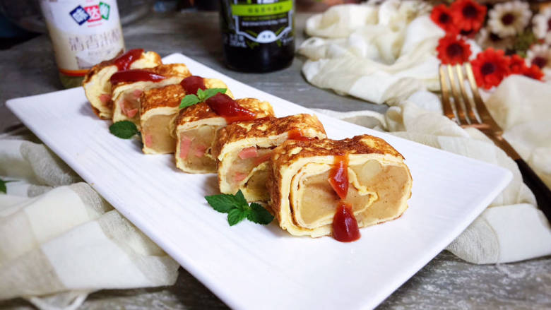 10. 用蛋皮包住土豆泥,卷成卷,摆一头