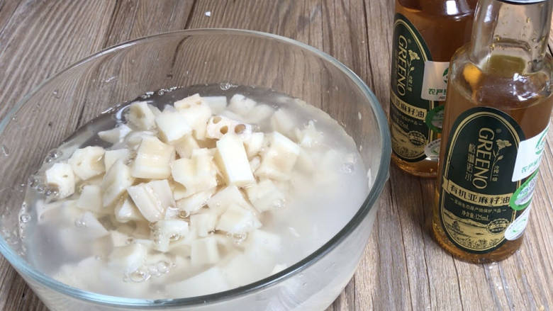 2. 莲藕去皮洗净后切成小丁,洗净淀粉,沥水备用