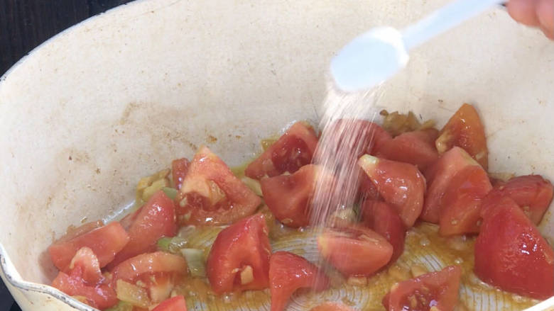 10. 放入番茄炒匀,加盐炒匀至出番茄汁