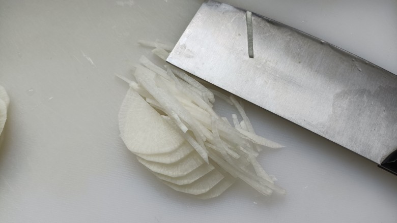 13. 葱蒜炒香后,倒入白萝卜翻炒;